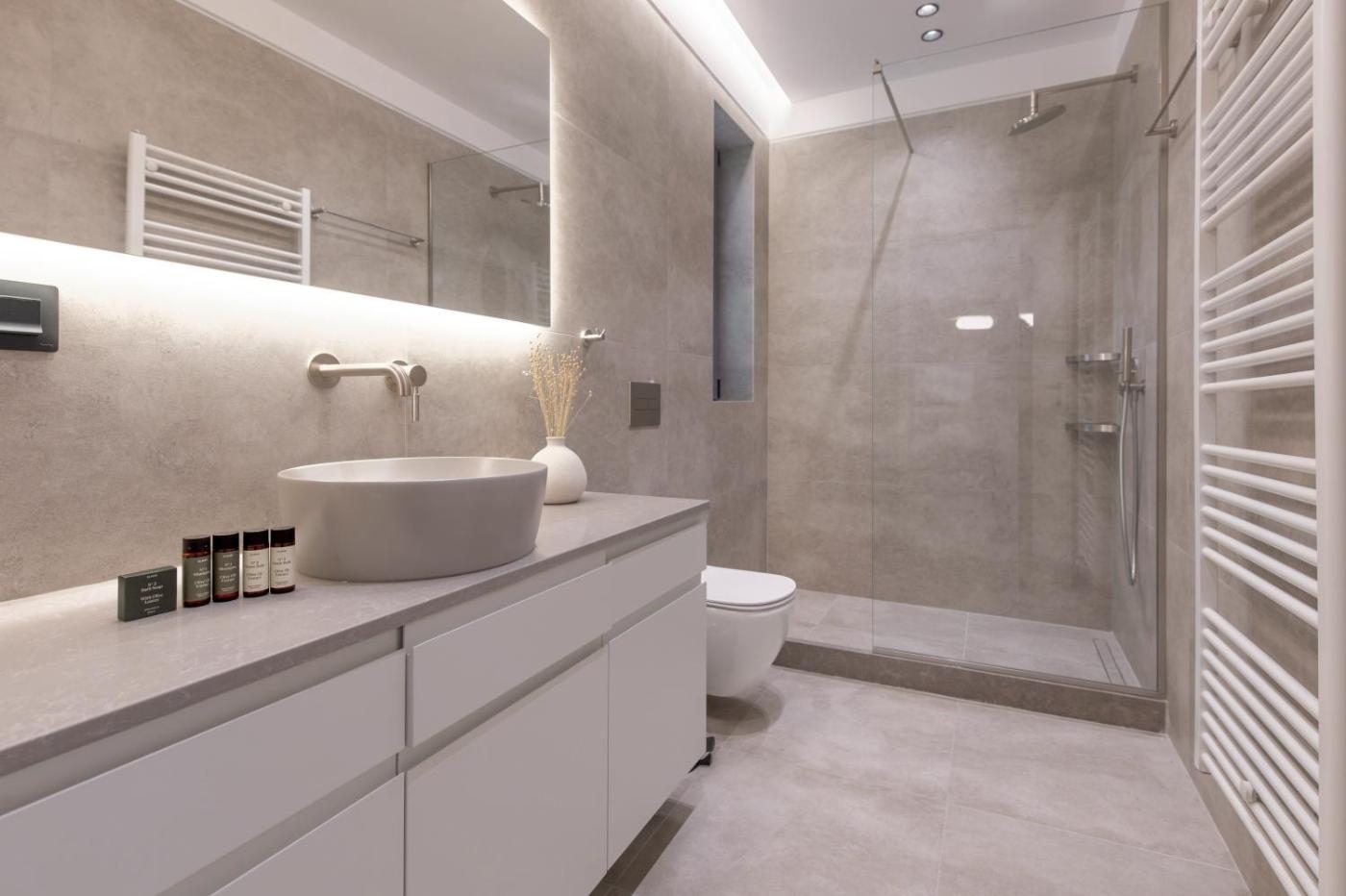 One-Bedroom Apartment. The spacious apartment features 1 bedroom and 1 bathroom with a shower and free toiletries. Guests can make meals in the kitchen that is equipped with a stovetop, a refrigerator, a dishwasher and kitchenware. The air-conditioned apartment provides a flat-screen TV, a washing machine, a tea and coffee maker, a wardrobe as well as city views. The unit offers 1 bed.