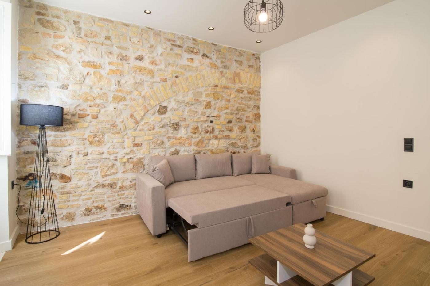 One-Bedroom Apartment. This air-conditioned apartment comprises 1 living room, 1 separate bedroom and 1 bathroom with a shower. Guests can make meals in the kitchen that is equipped with a stovetop, kitchenware, an oven and a tea and coffee maker. The apartment provides a washing machine, a wardrobe, parquet floors, as well as a flat-screen TV. The unit offers 2 beds.