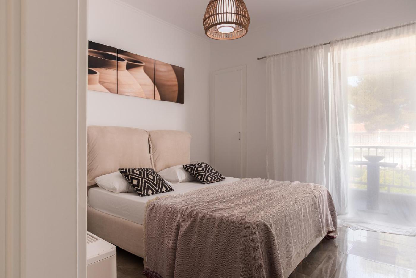 Two-Bedroom Apartment. Featuring a private entrance, this air-conditioned apartment comprises 1 living room, 2 separate bedrooms and 1 bathroom with a bath or a shower and a hairdryer. In the fully equipped kitchen, guests will find a refrigerator, kitchenware, an oven and a microwave. Boasting a balcony with sea views, this apartment also provides a washing machine and a flat-screen TV. The unit offers 3 beds.