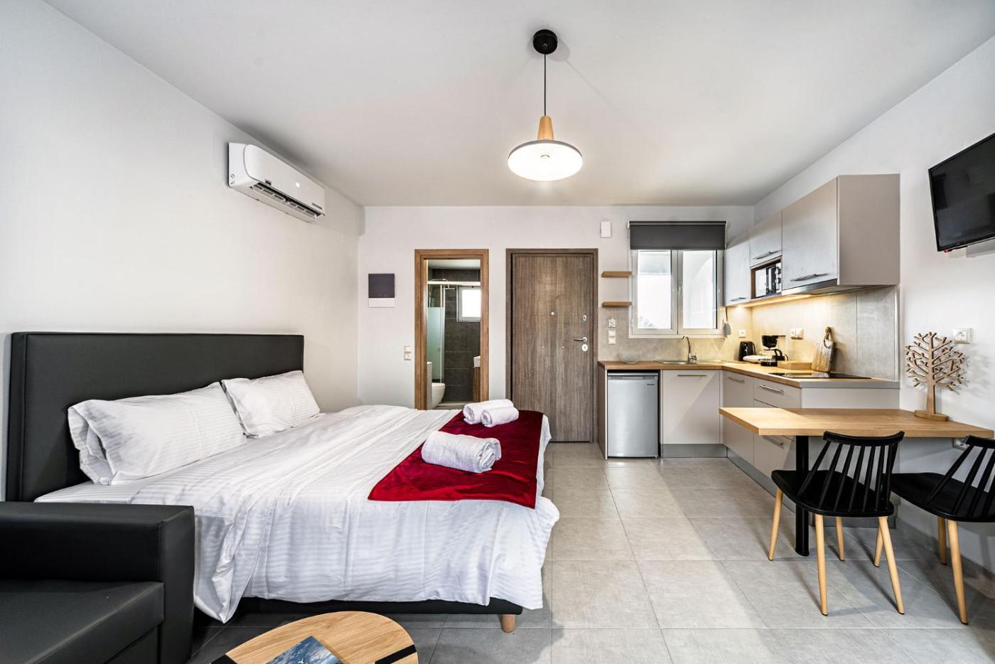 Deluxe Double Studio. The fully equipped kitchen has a refrigerator, a microwave and a tea and coffee maker. The studio features air conditioning, a washing machine, a terrace with mountain views as well as a private bathroom boasting a bath or a shower. The unit has 2 beds. ;