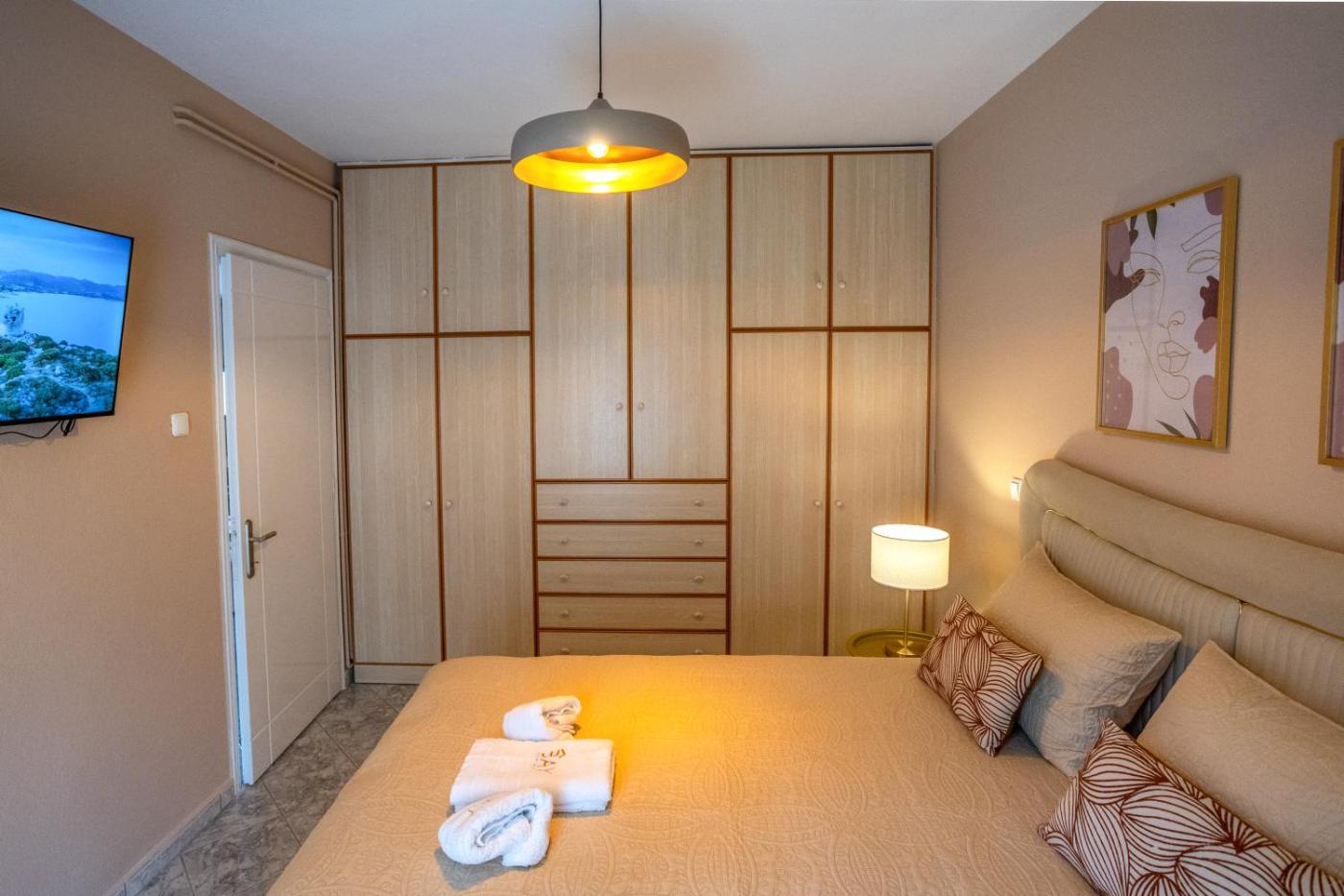 Two-Bedroom Apartment. The apartment provides a wardrobe, a sofa, as well as a shared bathroom boasting a bath and a hairdryer. In the well-equipped kitchen, guests will find a stovetop, a refrigerator, a dishwasher and kitchenware. The spacious air-conditioned apartment features a flat-screen TV with streaming services, a washing machine, a tea and coffee maker, a seating area as well as sea views. The unit has 3 beds.