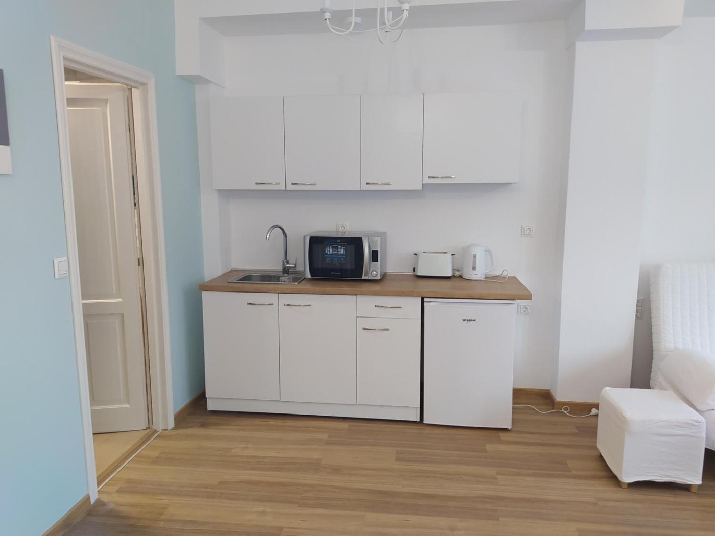 Studio. In the kitchenette, guests will find a refrigerator, a microwave, a tea and coffee maker and a toaster. The studio offers air conditioning, a private entrance, a balcony with city views as well as a private bathroom boasting a walk-in shower. The unit has 1 bed. ;
