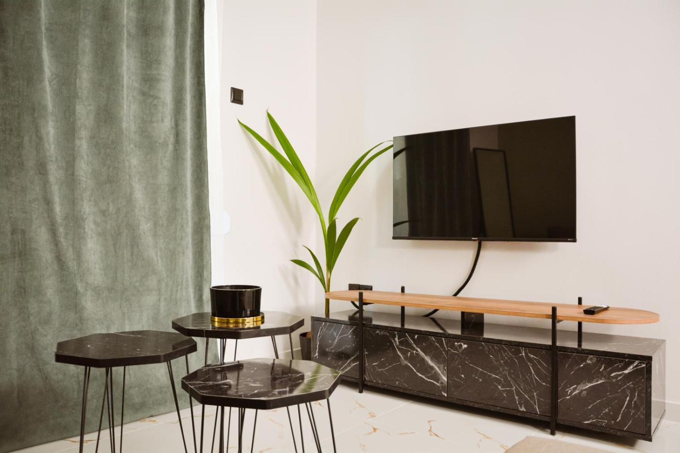 One-Bedroom Apartment. This apartment comes with 1 living room, 1 separate bedroom and 1 bathroom with a shower and free toiletries. In the well-fitted kitchen, guests will find a stovetop, a refrigerator, kitchenware and an oven. The air-conditioned apartment features a flat-screen TV with streaming services, soundproof walls, a tea and coffee maker, a seating area as well as city views. The unit has 2 beds.