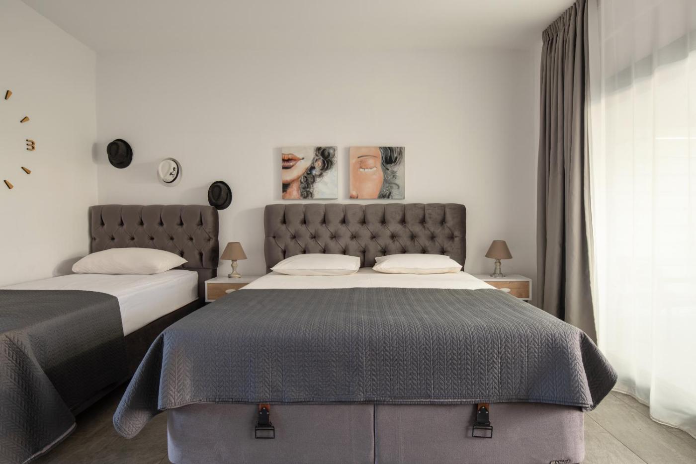 Deluxe Triple Room with Sea View. Guests will find a stovetop, a refrigerator, kitchenware and a tea and coffee maker in the well-equipped kitchen. The triple room also offers a barbecue. The triple room provides air conditioning, soundproof walls, a terrace with sea views as well as a private bathroom featuring a shower. The unit offers 2 beds. ;